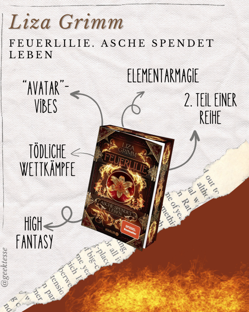 „Feuerlilie. Asche spendet Leben“ knüpft direkt an die Ereignisse des Vorgängerbands an und führt die Lesenden erneut in eine komplexe, faszinierende Welt voller Elementmagie, Geheimnisse und liebenswerter Charaktere. Liza Grimm schreibt gewohnt flüssig und bildhaft, sodass man schnell wieder in die Geschichte eintaucht – auch wenn es bei mir ein wenig gedauert hat, bis ich mich in alle Namen und Begriffe wieder hineingefunden hatte. Ein kleines Verzeichnis oder eine etwas längere Zusammenfassung zu Beginn hätte hier sicherlich geholfen. Die Handlung schreitet eher gemächlich voran, was mir grundsätzlich gut gefallen hat, da nicht alles auf Anhieb gelingt und die Figuren mit Rückschlägen umgehen müssen. Das ist zwar einerseits gut, weil sich so nicht alles überschlägt und vieles glaubhafter macht. Gleichzeitig hatte ich das Gefühl, dass innerhalb dieses Bandes nicht allzu viel passiert und sich das Buch stärker wie ein Zwischenstück zur Fortsetzung anfühlt. Eine kleine neue Erkenntnis oder ein größerer Fortschritt in der Handlung hätte ich mir gewünscht, um dem Band mehr Eigenständigkeit zu geben. Trotzdem habe ich das Lesen sehr genossen – die Zeit verging wie im Flug, und ich bin nur so durch die Seiten gerauscht. Besonders Katso und Nara haben mir in ihrer Charakterisierung sehr gefallen. Liza Grimm versteht es, lebendige Figuren zu erschaffen, die einem ans Herz wachsen. Wie immer liebe ich es, wenn die zwei uns Lesenden die gleichen Locations oder Leute unterschiedlich beschreiben – kann mir gut vorstellen, dass sie da ein bißchen damit spielt und wir zB. ein oder zwei der vermummten Charaktere bereits von einem anderen POV kennen. Alles in allem ein spannender, atmosphärischer Band, der Lust auf das Finale macht – auch wenn er sich etwas stärker als Bindeglied zwischen den großen Ereignissen anfühlt. Und ich immer noch nicht weiß ob der nächste Band wirklich der Abschluss ist – ich spekuliere ja auf 5 Bände. 4 für die Elemente und der letzte für „neutral“ bzw. die Ungebunden.